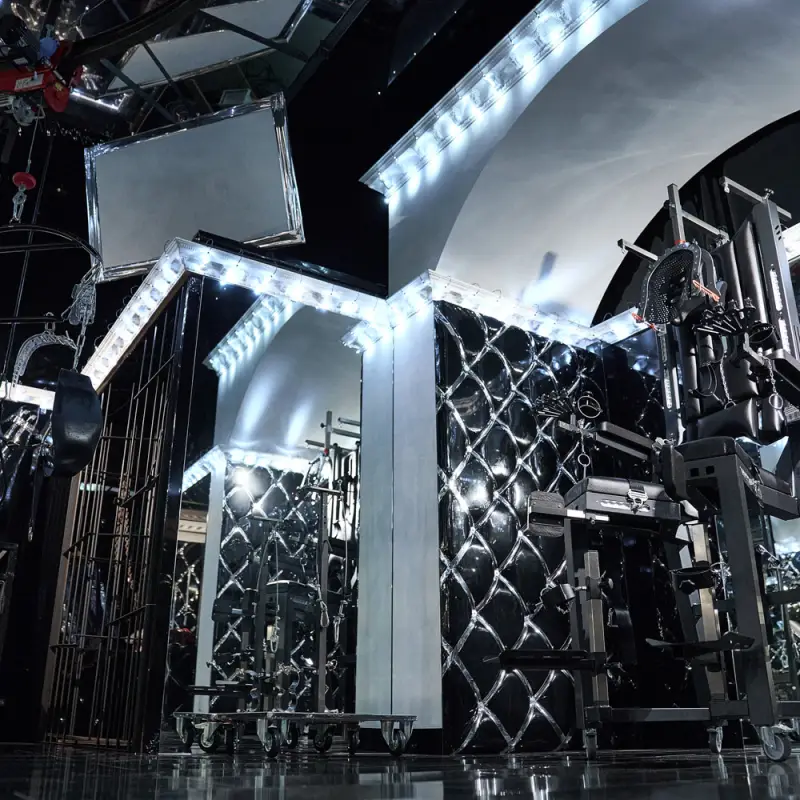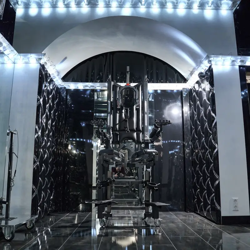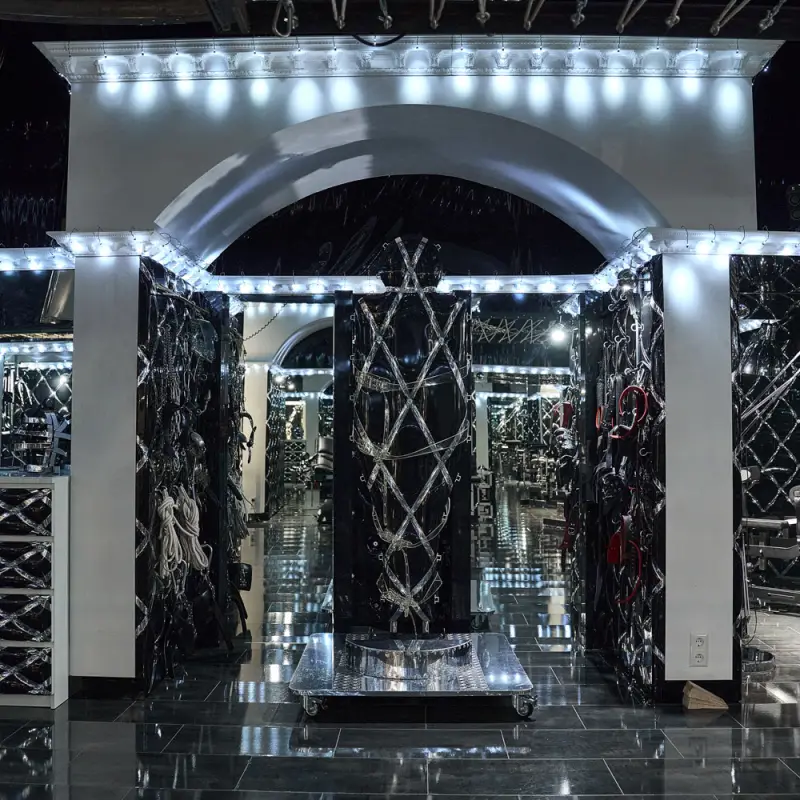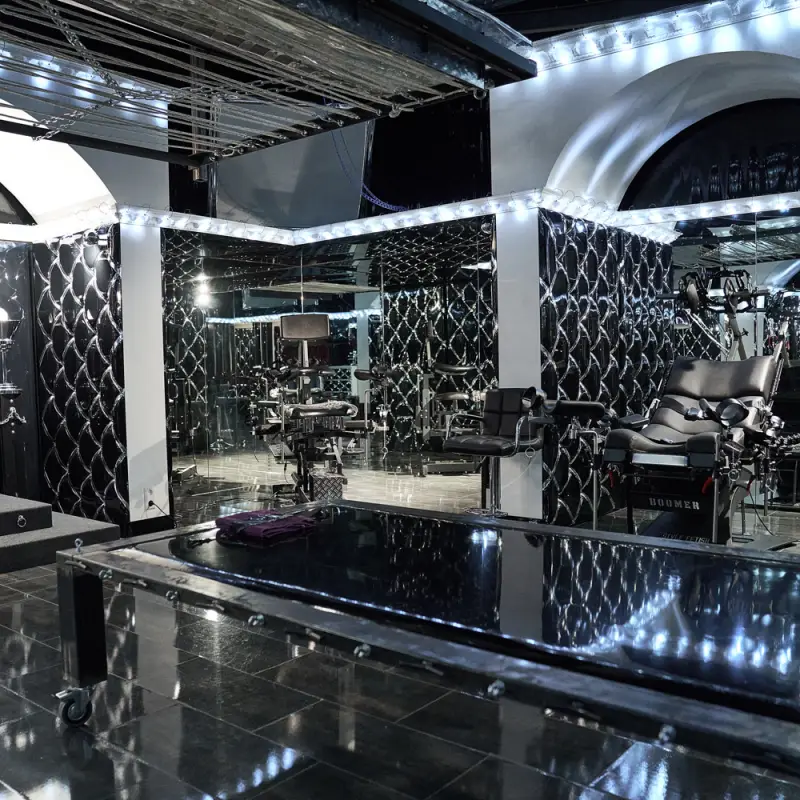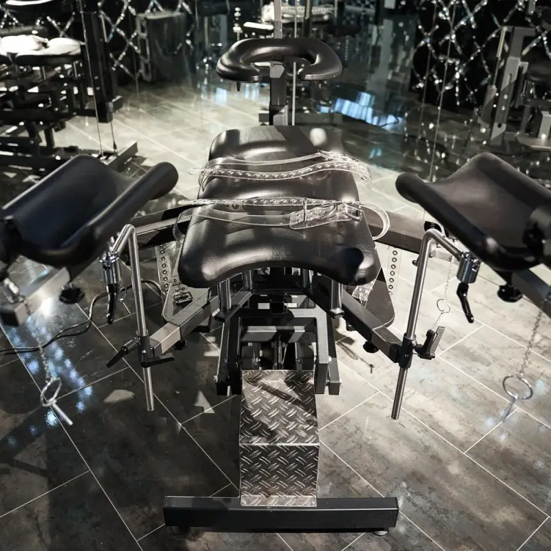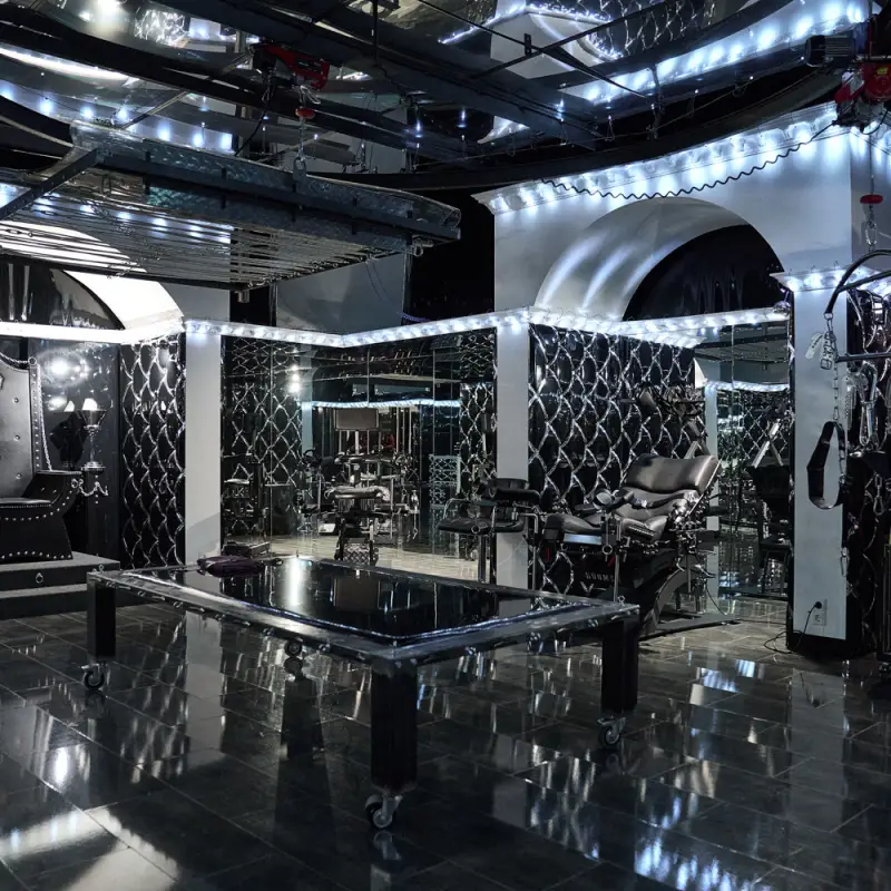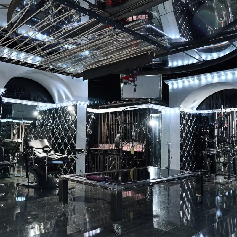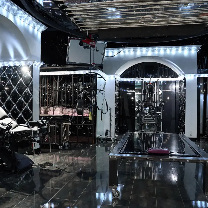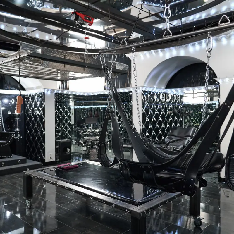 Hier findest du das Sklavenkarussell, einen schwenkbaren Bondagerahmen, den Käfig für Langzeitaufenthalte, eine Liebsschaukel und verschiedene Fixierungsliegen und nicht zu vergessen des Drehkreuz.