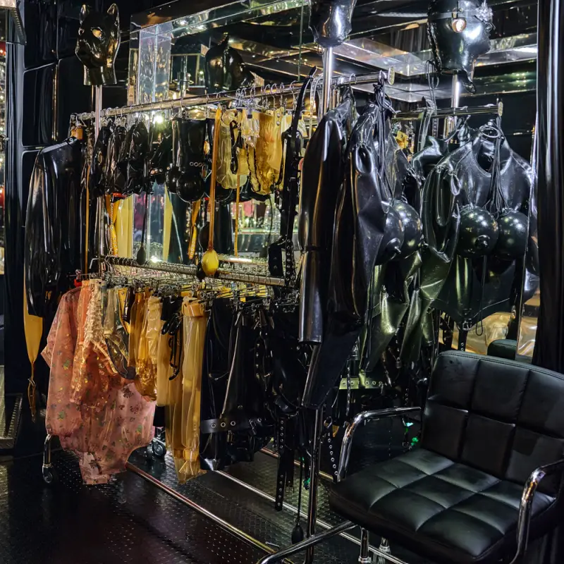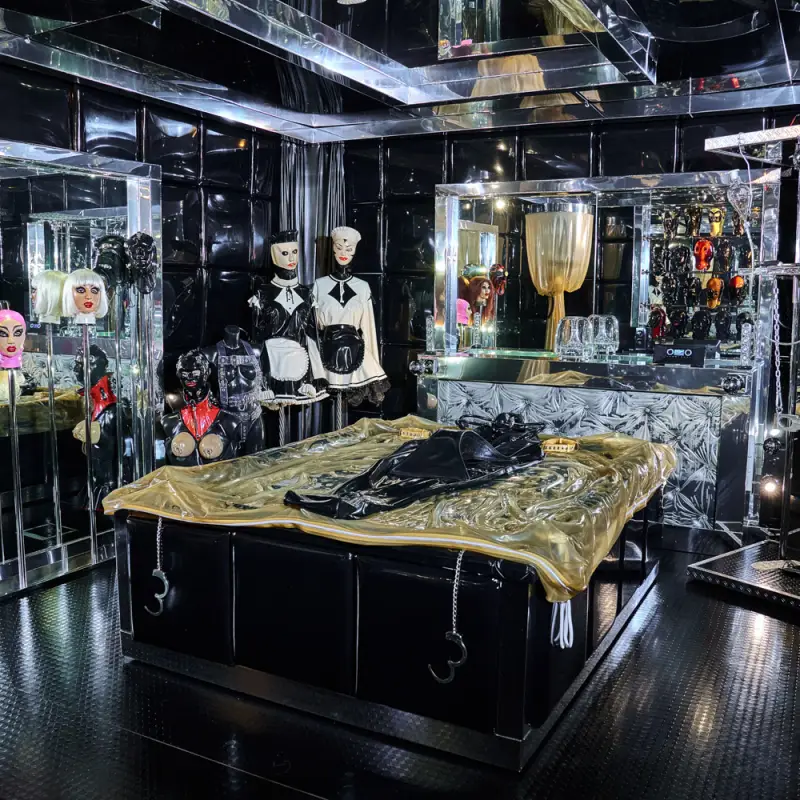 In unserer Rubbersuite machen wir Dich mit dem Gummi-Equipment von HW-Design zur Rubberdoll – inklusive Mösenmaske und perfektem Makeup. Das angemessene Ambiente für die neu geschaffene Frau-Puppe und für alle anderen Gäste, denen Latex Lust macht, ist in der Rubber-Suite zu finden – glänzendes, öliges Latex, wohin das Auge blickt, alle Sinne pulsieren, sind aufs höchste angespannt, warten auf das heißbegehrte Body-to-Body-Feeling – Nichts als Latex trennt Haut von Haut, die Latexgöttin ist unerreichbar nah. Im Wasserbett schwappen Lust und Hingabe über.